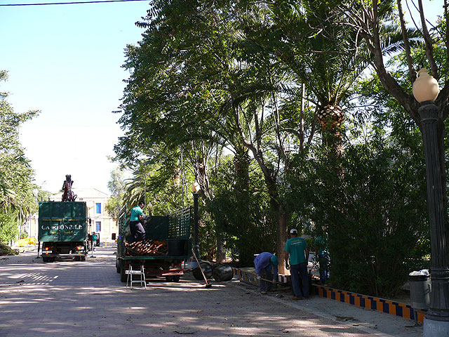 El Paseo Poeta Lorenzo Guardiola de Jumilla va a lucir mejor en las Fiestas de Agosto de este año. El Ayuntamiento tiene previsto modificar el alumbrado de la parte central y el lateral izquierdo. Además, recientemente, han concluido los trabajos de poda de todas las palmeras de este paseo, según han confirmado el concejal de Jardines Antonio Martínez y el alcalde y concejal de Obras Francisco Abellán.