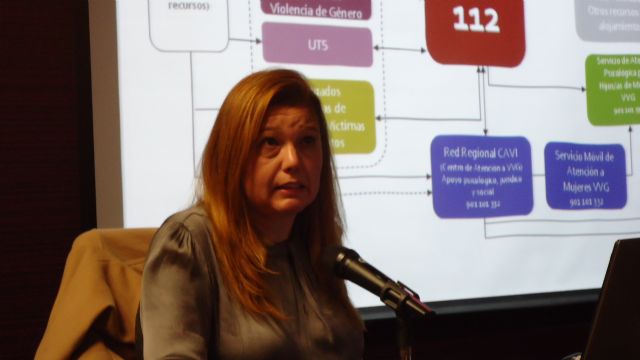 La ponente, Ángela Albaladejo, ofreció información acerca de los tipos de relaciones de pareja en los que se dan relaciones de desigualdad, así como de los ciclos de la violencia con sus distintas fases. Hizo hincapié en la necesidad de fortalecer a la víctima con un sistema de apoyo social que le de garantías para adoptar la decisión de salir de la situación de violencia que sufra.