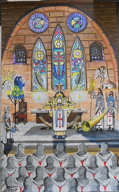 “Misa antes de raid”, título del óleo sobre lienzo, realizado por Iñaki, interno en el Centro Penitenciario de Teruel, ha sido elegido por los Templarios de Jumilla para ilustrar el cartel anuncio de la XI Guardia Templaria a Nuestra Señora que, siguiendo el tradicional calendario canónico, y el contenido de las Actas Capitulares del Concejo de la villa de Jumilla (s. XVII), tendrá lugar en la ermita de San Agustín (s.XVI), en la vigilia del domingo 4 de agosto, de cero a seis horas, en el que los milites Christi de la ciudad murciana famosa por el temple de sus vinos,  abren el programa de actos patronales en honor a la Santísima Virgen de la Asunción Excelsa Patrona del Concejo Municipal.