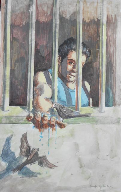 La acuarela "pajaricos" del interno F.G.C. del MII, ha sido seleccionada por los templarios jumillanos para ilustrar el cartel anuncio de los actos conmemorativos en honor a la patrona de cautivos, excautivos y funcionarios de prisiones, que durante el mes de septiembre tiene por escenario el Área Sociocultural y canchas de deportes del centro penitenciario, en el que música, danza, literatura, deporte, poesía y bellas artes se dan cita para honrar a la Santísima Virgen María de la Merced, a cuyo honor se exhibirá la edición 2013 Presos de las Bellas Artes y Artesanía templaria con más de medio centenar de trabajos plásticos y artesanales realizados por internos en centros penitenciarios del territorio español dependientes de la Dirección General de Instituciones Penitenciarias que participan en el proyecto templario, evento que, un año más, también cuenta con la participación de los centros penitenciarios catalanes de Gerona, Tarragona, y Ponent (Lérida).