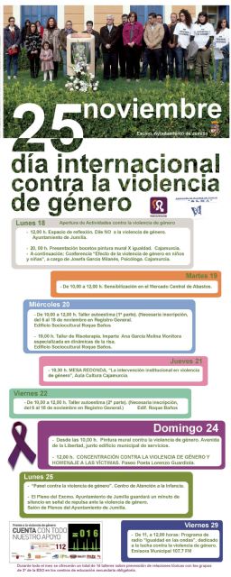 Lunes 25 de noviembre, en el Centro de Atención a la Infancia, los niños y niñas realizarán un "Panel contra la violencia de género", y por la noche, en el Pleno del Ayuntamiento de Jumilla del mes de noviembre, los concejales y concejalas guardarán un minuto de silencio en señal de repulsa ante la violencia de género.