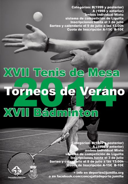Por otra parte, Deportes ha abierto el plazo de inscripción para los torneos del verano 2014, de tenis de mesa y bádminton, de forma, que las personas interesadas, deberán inscribirse en el Pabellón Municipal de Deportes Carlos García, hasta el 3 de julio. El sorteo y calendario de tenis de mesa se realizará el 9 de julio, mientras que el de Bádminton tendrá lugar el 8 de julio, ambos a la 13.00 horas, en el Pabellón.