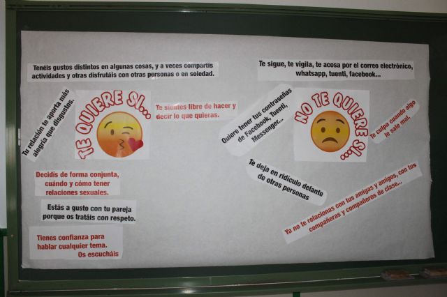 Complementando la actividad se colocará un cartel dinámico en cada centro en el que, mediante una actividad reflexiva, el alumnado de 3° de la ESO, colocará diversas frases sobre lo que consideren que es relación afectiva sana o tóxica.