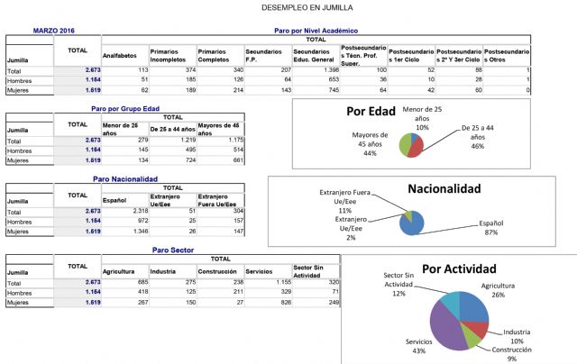Las cifras del desempleo en Jumilla han descendido en 83 personas en marzo. Se cierra el mes con 2.673 desempleados, que son 278 menos que en el mismo momento del pasado año. Se mantienen, por tanto, números similares a los del año 2010, cuyo número de parados al final del mes de marzo era de 2.671.
