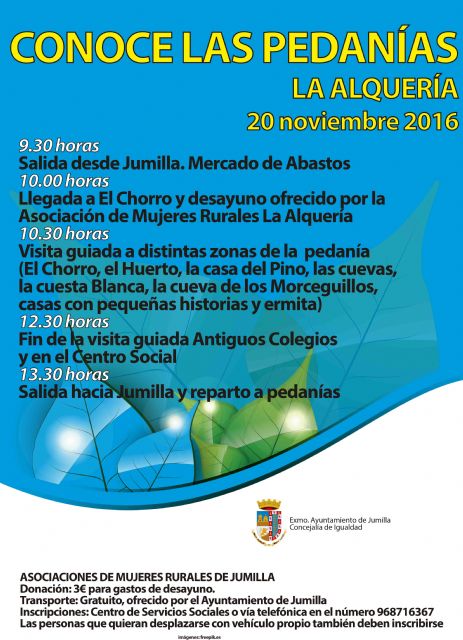 La Alquería será la cuarta cita del Programa 'Conoce las pedanías' que puso en marcha el pasado mes de mayo la Concejalía de Igualdad del Ayuntamiento de Jumilla con el que durante varios meses, a propuesta de las asociaciones de mujeres rurales, se visitan a fondo varias zonas del término municipal.Tras pasar con gran afluencia de público por Fuente del Pino, Las Encebras y Cañada del Trigo, llega el turno de La Alquería el próximo 20 de noviembre.