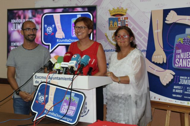 La alcaldesa de Jumilla, Juana Guardiola, el presidente de la Federación de Peñas de la Fiesta de la Vendimia, Francisco Javier Vázquez y la coordinadora del Centro de Hemodonación de la Región de Murcia, Antonia Gómez, acompañados por la concejala de Salubridad, Lucía Jiménez, han presentado esta mañana la segunda edición de la campaña 'Está en nuestra sangre' puesta en marcha de nuevo por la Fiesta de la Vendimia en busca de aumentar todavía más el número de donaciones de sangre en el municipio.