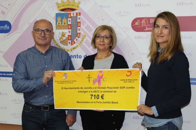 Se trata de 710 euros que han sido recogidos por la presidenta de la AECC en Jumilla, Dami Herrero, a través de un simbólico cheque entregado por el concejal de Comercio, Juan Gil, y la secretaria del Consejo Regulador de la Denominación de Origen Protegida Vinos de Jumilla, Carolina Martínez.