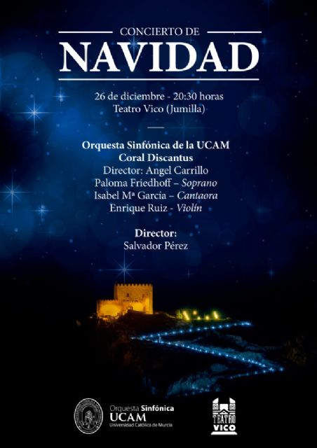 Este miércoles 26 de diciembre el Teatro Vico acogerá un concierto de Navidad de los que pueden verse en la programación de cualquier gran teatro, no sólo de la Región sino del resto del país. Un programa de lo más variado donde no faltarán los tradicionales villancicos de Navidad a los que pondrán voz la Coral Discantus de Murcia y la laureada soprano Paloma Friedhoff, conocida en Jumilla por otras actuaciones con la Compañía Lírica Julián Santos y la Sinfónica de la UCAM.