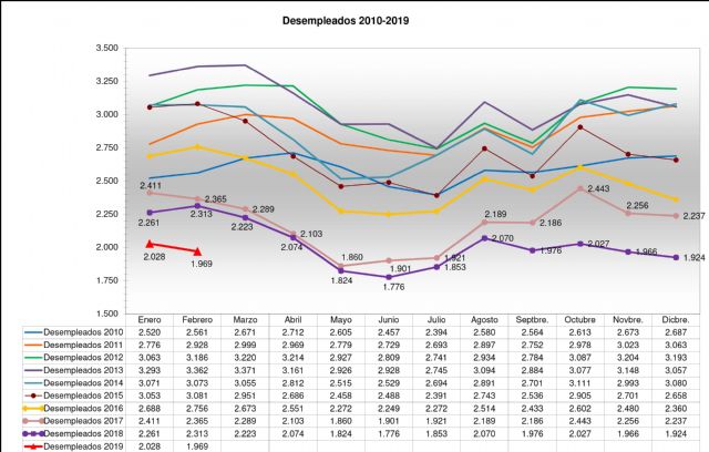 Jumilla ha finalizado el mes de febrero con 59 parados menos que en el mes anterior y 344 menos que en la misma fecha del pasado año. De nuevo la cifra total de desempleados se sitúa por debajo de los dos millares de personas, exactamente en 1.969 de demandantes de empleo. "De esas 59 personas, la mayoría han sido mujeres, siendo por tanto la lectura más positiva que podemos sacar", ha señalado el concejal de Economía y Empleo, Juan Gil.