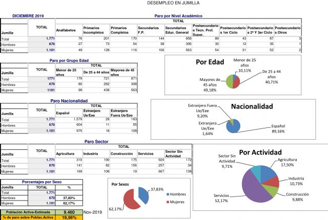 Jumilla ha finalizado el año 2019 con 153 desempleados menos que en el final de 2018. La cifra actual de personas en paro es de 1.771. Igualmente, tras dos meses de subidas, en el mes de diciembre ha descendido en 79 personas en diciembre 2019 respecto del mes de noviembre. Esta variación ha sido más acentuada en el desempleo femenino con un descenso de 58 mujeres frente a una disminución de 21 hombres.