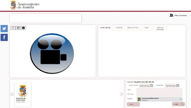 El Ayuntamiento de Jumilla ha implantado el sistema de videoacta para las sesiones de los plenos municipales, con el fin de seguir mejorando en transparencia institucional, simplificación y modernización administrativa. Se ha puesto en marcha en el pleno ordinario de junio celebrado este lunes. Utiliza la grabación en vídeo de los plenos, que se lleva a cabo a través de una cámara instalada en el salón de sesiones y que es capaz de tomar múltiples planos diferentes. El sistema ha tenido un coste de 11.789 euros.
