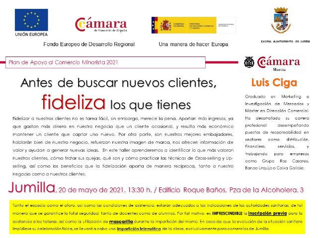 El próximo jueves 20 de mayo se retoman en Jumilla los Almuerzos del Comercio con un curso denominado "Antes de buscar nuevos clientes, fideliza los que tienes, según se informa desde la Concejalía de Economía y Empleo.