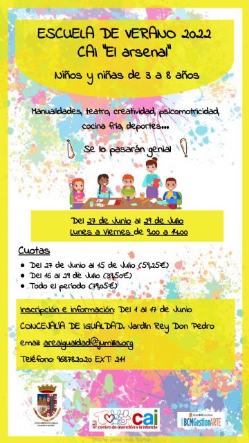 Este miércoles 1 de junio se abre el plazo de inscripciones para participar en la Escuela de Verano, que se desarrollará del 27 de junio y 29 de julio en el Centro de Atención a la Infancia 'El Arsenal'.