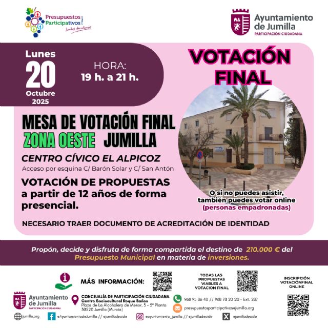 El Ayuntamiento de Jumilla ha hecho públicas ya las fechas del proceso de votación final de las propuestas viables presentadas al programa de Presupuestos Participativos 2025/2026. Con este procedimiento se da voz a la ciudadanía para decidir el destino de 210.000 euros en inversiones tanto en el casco urbano como en pedanías y zonas rurales.