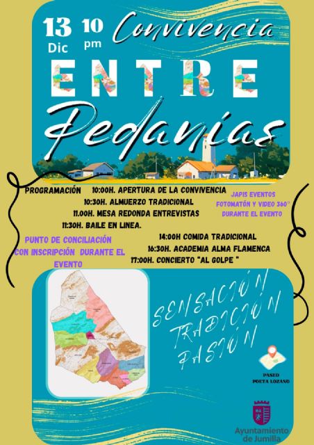 El Ayuntamiento de Jumilla ha presentado esta mañana la segunda edición del Encuentro Entre Pedanías, que tendrá lugar el próximo sábado 13 de diciembre a partir de las 10:00 horas en el Paseo Poeta Lorenzo Guardiola. La presentación ha sido a cargo de la concejala de Pedanías, Paqui Simón, quien ha estado acompañada por los alcaldes y alcaldesas pedáneas del municipio.
