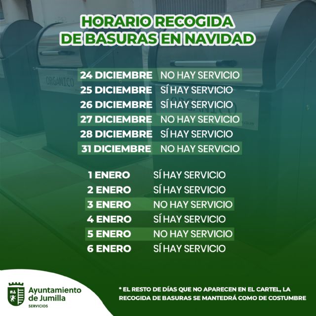 El Ayuntamiento de Jumilla ha establecido los horarios especiales del servicio de recogida de basuras y del Cementerio Municipal durante las fiestas navideñas, con el objetivo de seguir prestando el servicio con normalidad al tiempo que se favorece la conciliación familiar de los trabajadores municipales.
