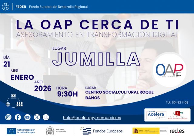 El próximo miércoles, 21 de enero, Jumilla acogerá una jornada gratuita de asesoramiento para empresas y autónomos organizada por el Centro Tecnológico de la Construcción de la Región de Murcia, a través de su Oficina Acelera Pyme. La actividad se celebrará en el Centro Sociocultural Roque Baños a partir de las 9:30 horas y está dirigida especialmente a pymes, profesionales y emprendedores que deseen avanzar en la digitalización de sus negocios.