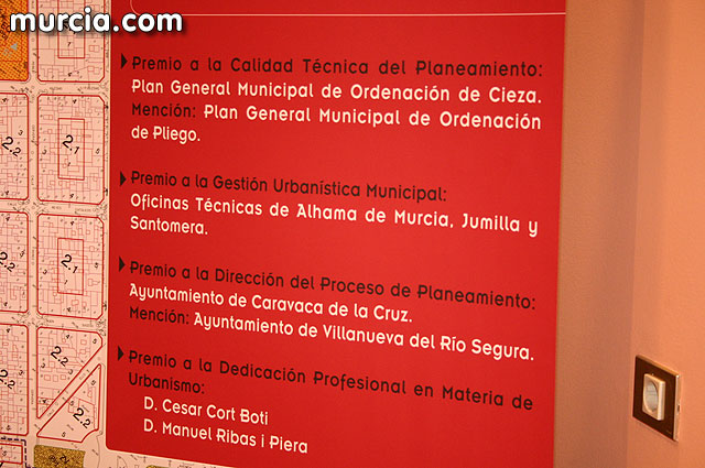 El jurado de los premios ha entregado también un galardón al Plan General Municipal de Ordenación de Cieza, dentro de la categoría de Premio a la Calidad Técnica del Planeamiento, en el que se valora el rigor técnico y la solución de modelos urbanos idóneos y sostenibles, en lo que destaca este Plan, considerado un modelo de referencia que establece como no urbanizable el 92 por ciento del suelo del municipio. En esta modalidad, también se ha hecho una mención al Plan General Municipal de Ordenación de Pliego, por el desarrollo de soluciones urbanísticas óptimas para el buen desarrollo del municipio en los próximos años.